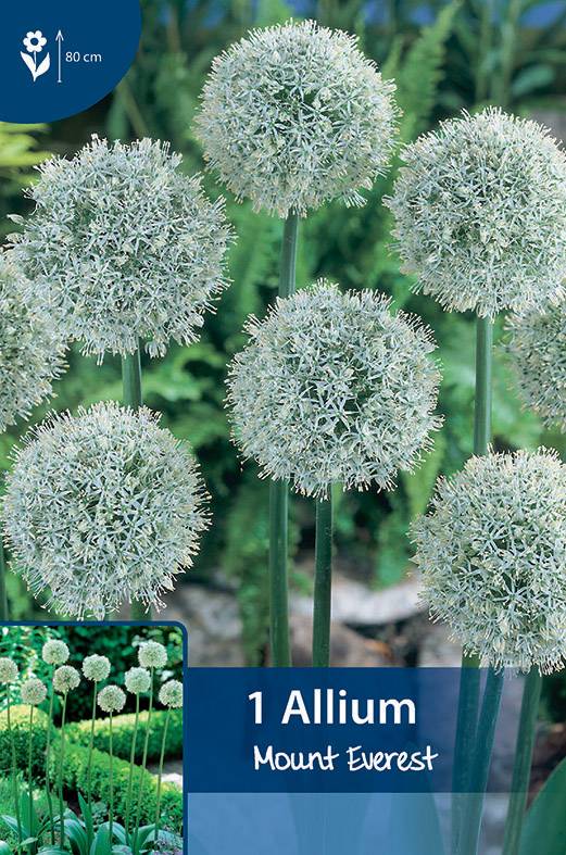 Pure white balls of florets rise above the foliage of this Allium on tall graceful stems producing a display of blooms that cannot be ignored. Shop Allium Mount Everest. Family Alliaceae Genus Allium are bulbous herbaceous perennials with a strong onion or garlic scent linear strap-shaped or cylindrical basal leaves and star-shaped or bell-shaped flowers in an umbel on a leafless stem Details Mount Everest is a hardy perennial.